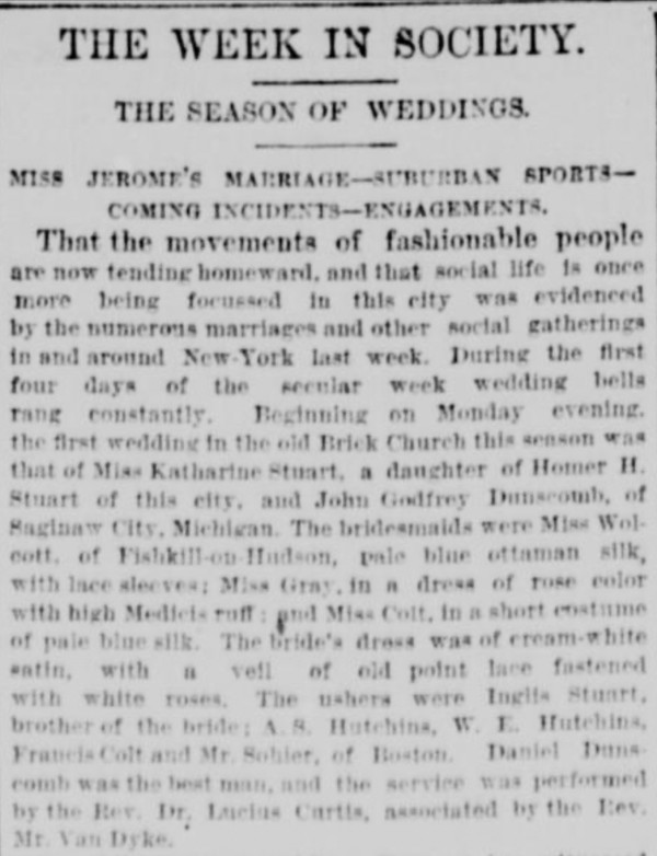 DUNSCOMB-STUART WEDDING ANNOUNCEMENT, NY TRIBUNE, OCT. 5, 1884
