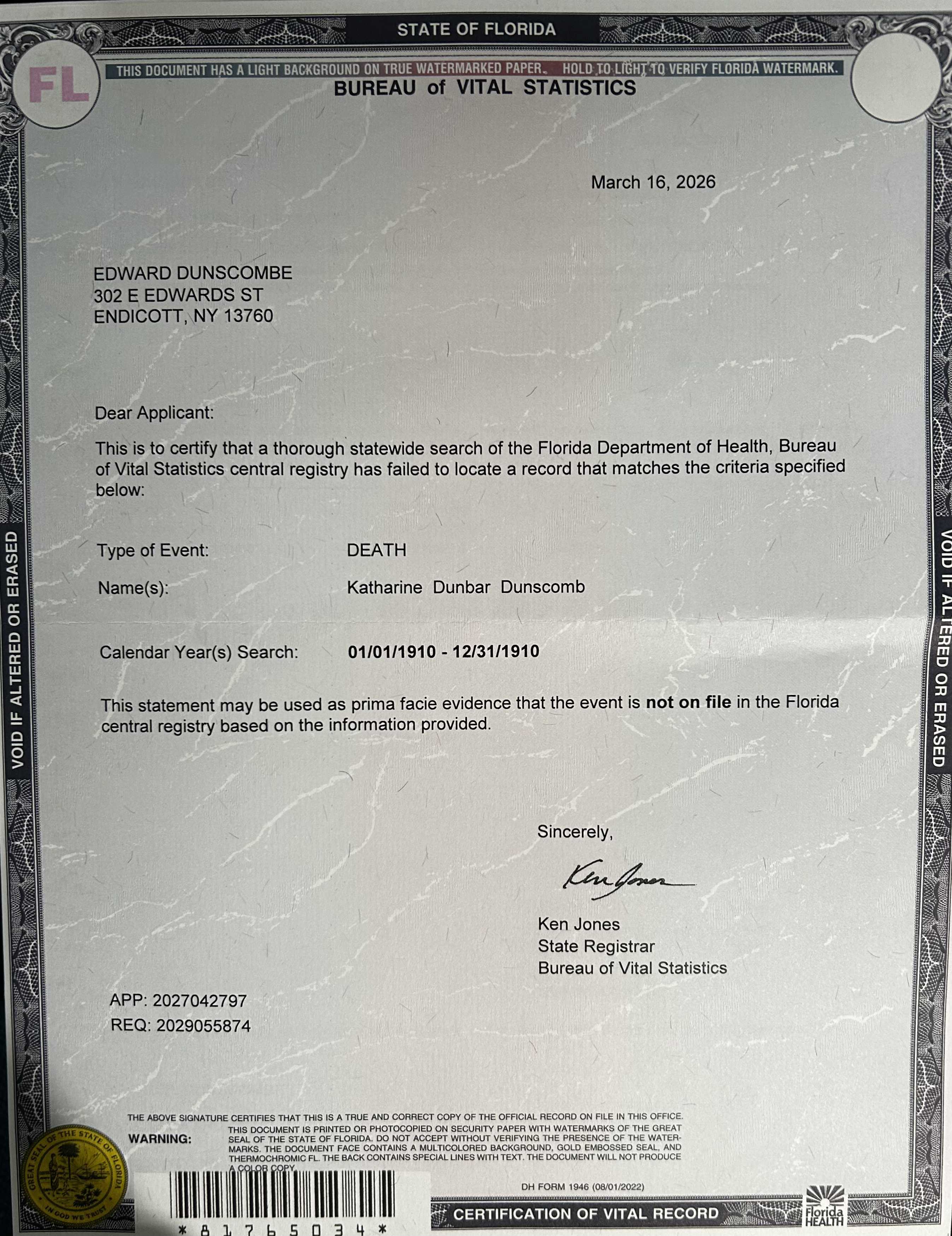 DUNSCOMBE, KATHARINE DUNBAR NO DEATH CERTIFICATE LETTER