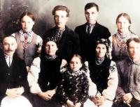 The John Breslawski family: standing, L-R: daughter Pauline, son John, unknown, daughter Nadia; Seated, L-R: John, second wife, Eva's daughter Maria, daughter Eva, son Theodore; Ukraine, ca. 1920