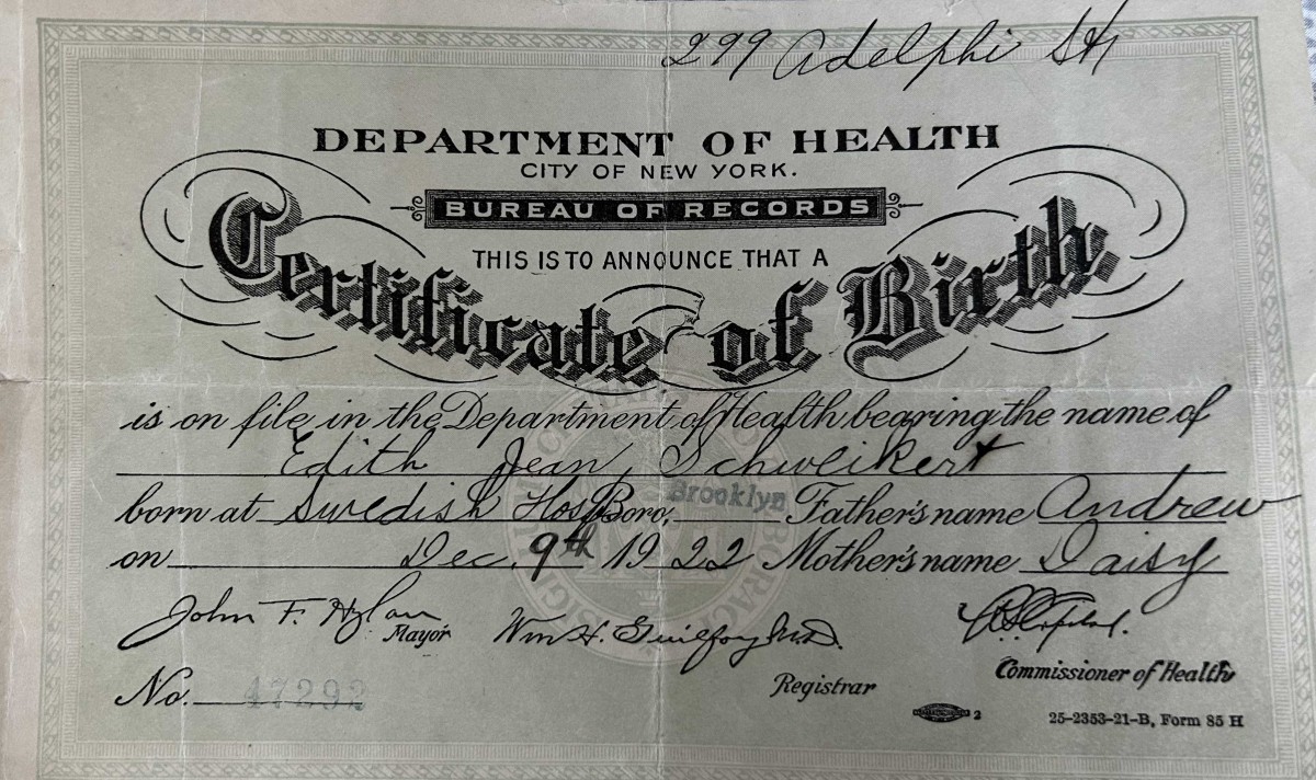 BIRTH CERTIFICATE OF EDITH SCHWEIKERT, 1922